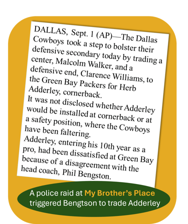 Just ahead of the bar's formal opening, a series of small but consequential events led to its overnight success. Later, that success would play an unwitting role in the infamous trades of Ice Bowl heroes Herb Adderley and Chuck Mercein.